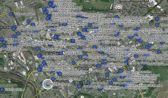 The process of mapping all 2000 addresses is a lengthy one that gives me lots of time to contemplate the significance of the list and lists of names.. So far I am only up to 367, less than a quarter and the map already looks like this. This is also taking into consideration that probably an eighth of the addresses are no longer existing, either as original houses or new houses build on the same site. This week I came across 3 addresses on Maudland Bank, number 69, 73 and 76, practically next door neighbours. I’m sure there will be more addresses close to them before I finish.